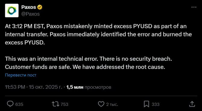 В среду ночью Paxos случайно напечатал 300 трлн единиц PYUSD (стейблкоин PayPal USD) - затем отправил весь объем на "сжигание", делая токены недоступными. Эмитент стейблкоина Paxos заявил, что это была техническая ошибка внутреннего перевода, а не взлом, и что средства клиентов не затронуты.