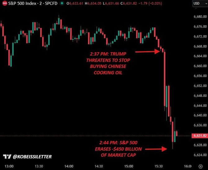 Всего за 7 минут после этого поста фондовый рынок США потерял $450 млрд, крипторынок тоже немного распродали.
